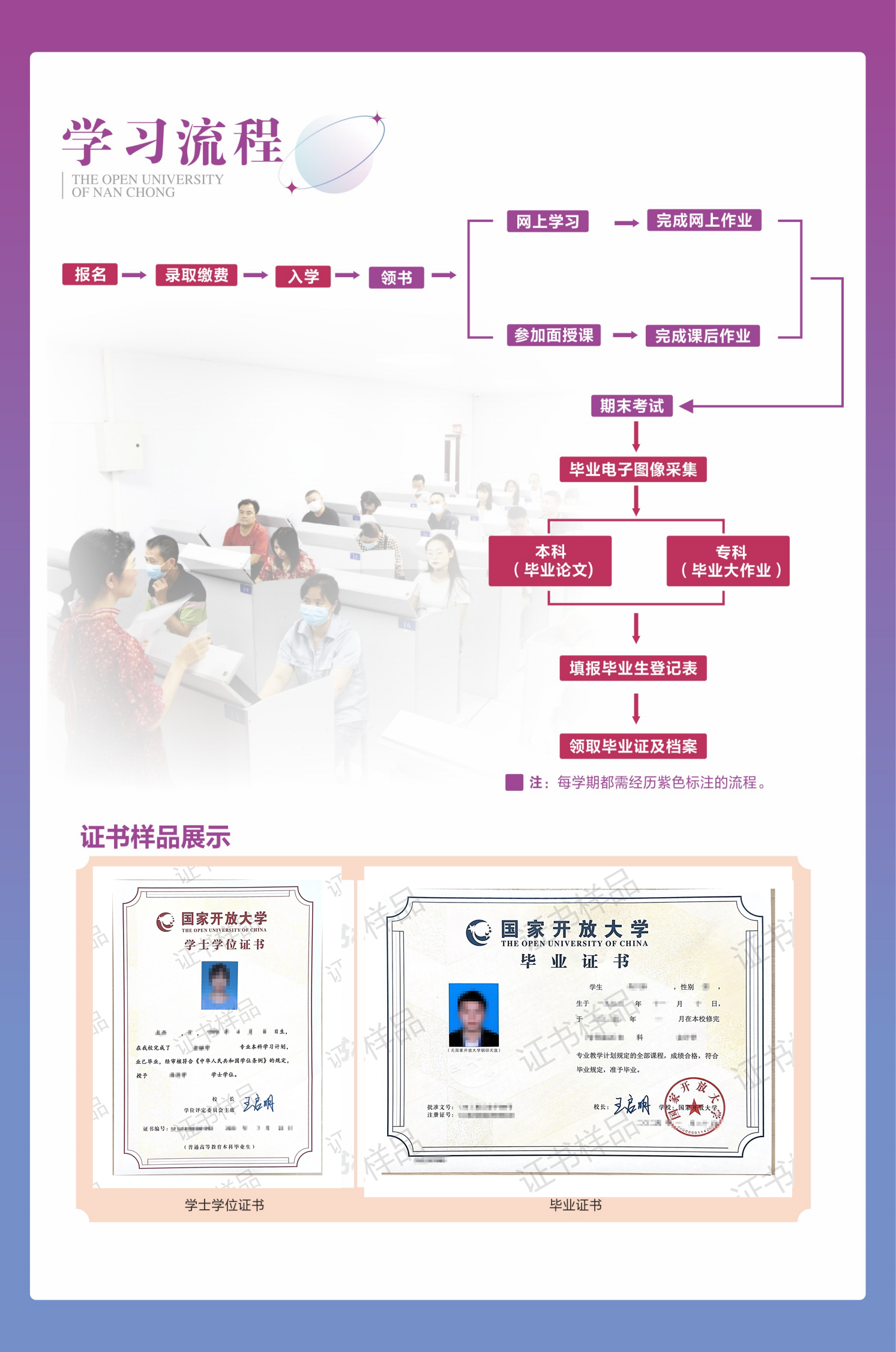 與普通高等教育相比,開放教育體現(xiàn)邊工作邊學(xué)習(xí),工作學(xué)習(xí)兩不誤;與成人函授教育相比,開放教育具有學(xué)習(xí)、輔導(dǎo)、考試、實(shí)驗(yàn)、實(shí)習(xí)等完整的教學(xué)過(guò)程,能夠獲得較為完善的教學(xué)支持服務(wù);與自考相比,開放教育強(qiáng)調(diào)教學(xué)全過(guò)程的落實(shí)和支持服務(wù)的提供,讓學(xué)習(xí)之路不再孤單。