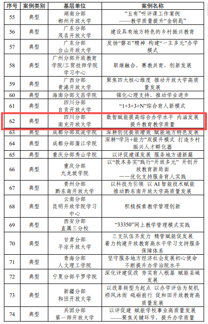 為進一步總結首輪分部辦學評估的工作成效和成功經(jīng)驗,凝聚發(fā)展合力,國家開放大學開展了辦學評估典型案例征集工作。按照代表性、示范性和可借鑒性要求,經(jīng)過分部推薦和專家審核,國家開放大學最終遴選出“基層辦學單位創(chuàng)優(yōu)典型案例”74個,南充開放大學申報的《數(shù)智賦能提高綜合辦學水平內涵發(fā)展提升教育教學質量》辦學案例成功入選。