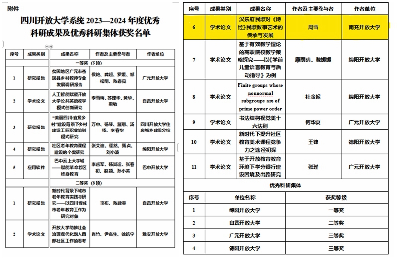 為充分調(diào)動全省開大系統(tǒng)教職工參與科研工作的積極性,加強科研成果的推廣、交流和應用,展示全省開大系統(tǒng)科學研究的成果,根據(jù)《四川開放大學系統(tǒng)科研工作指導意見》(川大校科〔2015〕10號)規(guī)定,四川開放大學開展了2023-2024年度優(yōu)秀科研成果與優(yōu)秀科研集體評選工作。我校周雪老師撰寫的學術(shù)論文《漢樂府民歌對〈《詩經(jīng)》〉民歌敘事藝術(shù)的傳承與發(fā)展》歷經(jīng)資格審查、專家評審、校學術(shù)委員會審議、校長辦公會審定等多輪嚴格篩選,最終榮獲優(yōu)秀科研成果三等獎。