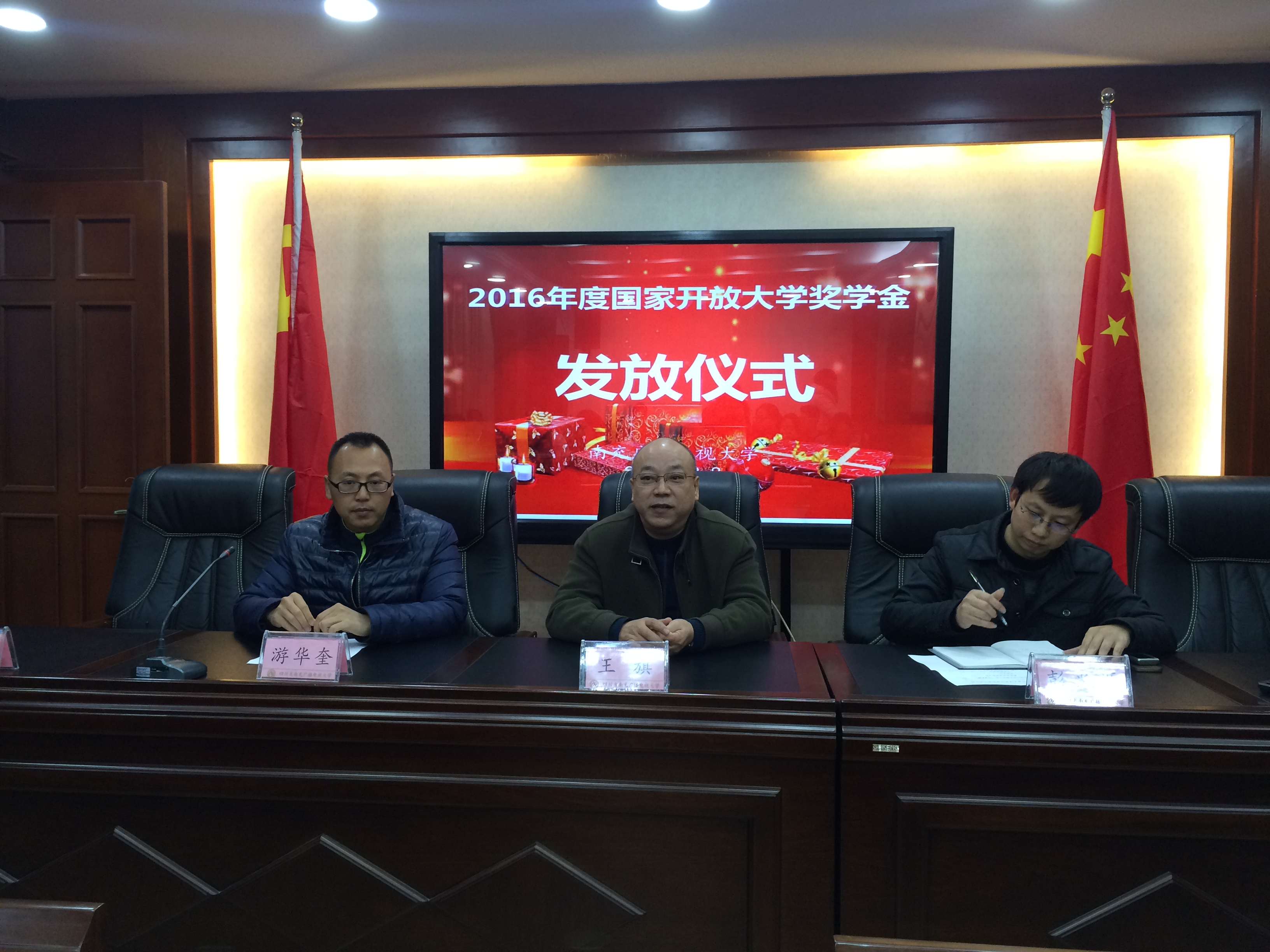 12月8日下午,南充電大舉行了2016年度國家開放大學(xué)獎學(xué)金發(fā)放儀式。南充電大副校長王旗為到現(xiàn)場參加領(lǐng)獎的21名同學(xué)頒發(fā)了證書及獎金。教務(wù)處、直屬部相關(guān)負(fù)責(zé)人參加了儀式。