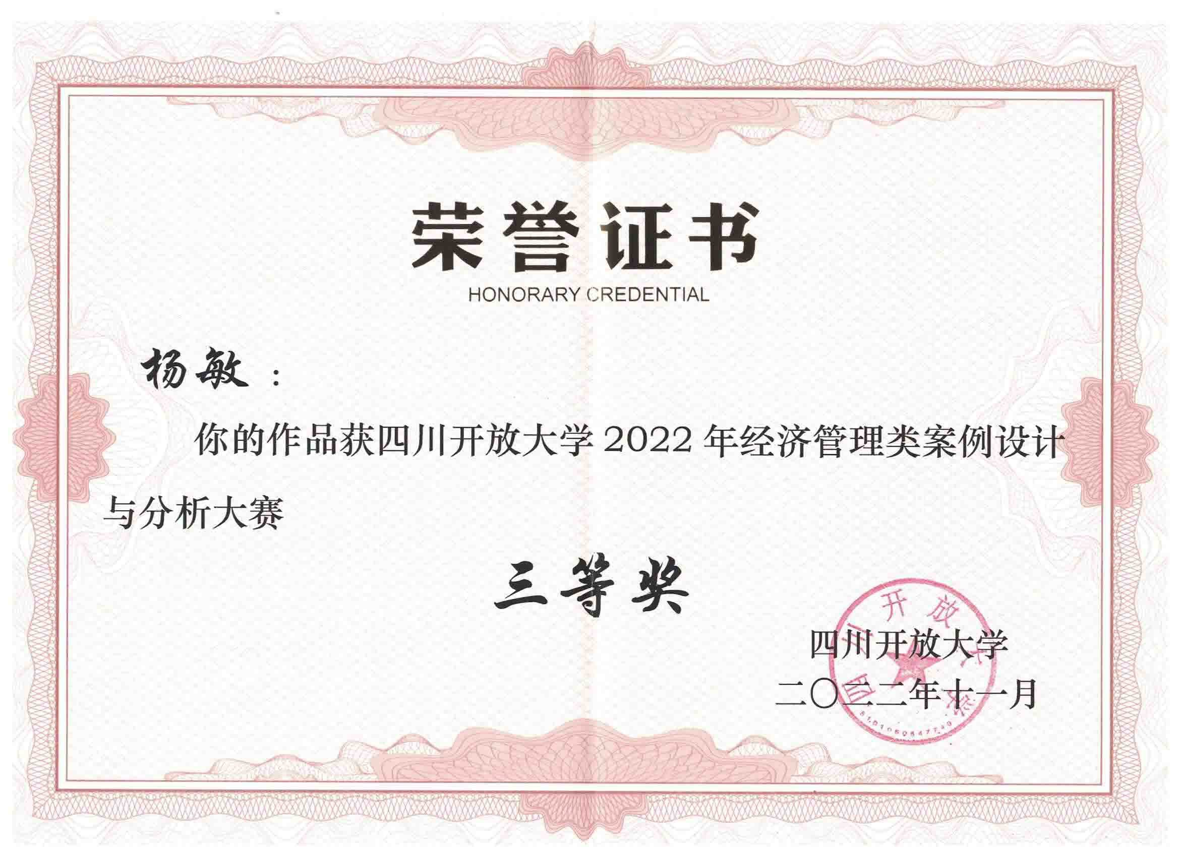 近日,四川開放大學(xué)組織的全省開放大學(xué)系統(tǒng)經(jīng)濟(jì)管理類案例設(shè)計與分析大賽評選結(jié)果出爐,我校2021年春季工商本科楊敏的作品《中小民營企業(yè)內(nèi)部控制案例分析》(指導(dǎo)教師:張文軍)榮獲三等獎。張文軍榮獲“優(yōu)秀指導(dǎo)教師”稱號。