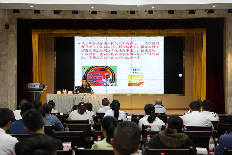 何洪周教授以《增強(qiáng)法治意識(shí),推進(jìn)依法治村》為題,從弄清“自治”與“法治”、努力增強(qiáng)法治意識(shí)、提升依法治村能力三個(gè)方面,對(duì)依法治村作了深入淺出地闡述,并理論聯(lián)系實(shí)際,對(duì)一系列正反案例進(jìn)行了剖析,以案說法、講解透徹,事例典型、語言生動(dòng),取得了很好的效果。
