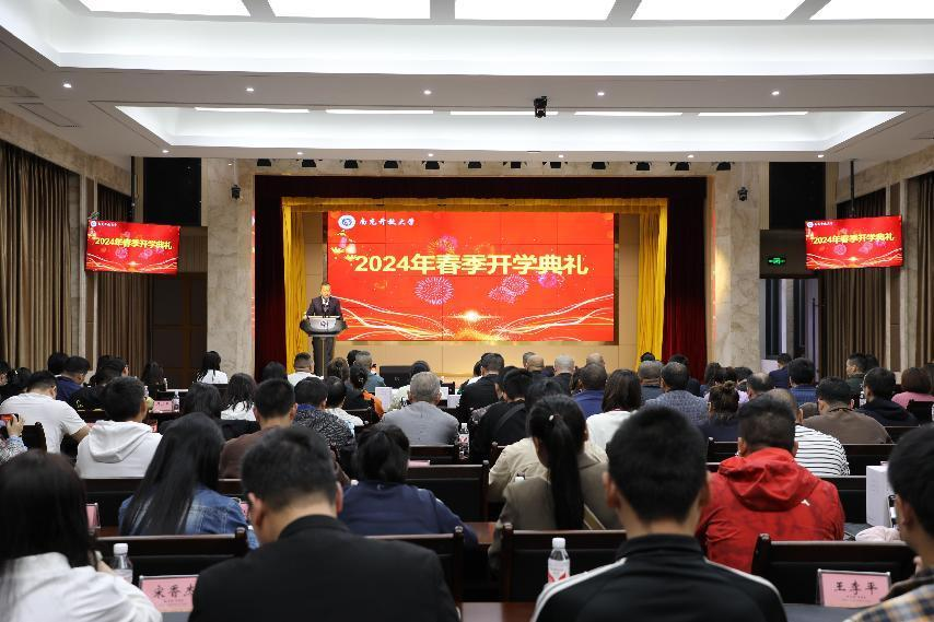 4月11日晚,南充開放大學2024年春季新生開學典禮在二樓多功能會議廳舉行。學校黨委書記、校長昝平出席典禮并致辭,學校黨委委員、副校長曲陽主持典禮。直屬部全體班主任、相關處室人員及150余名新生代表參加了典禮。