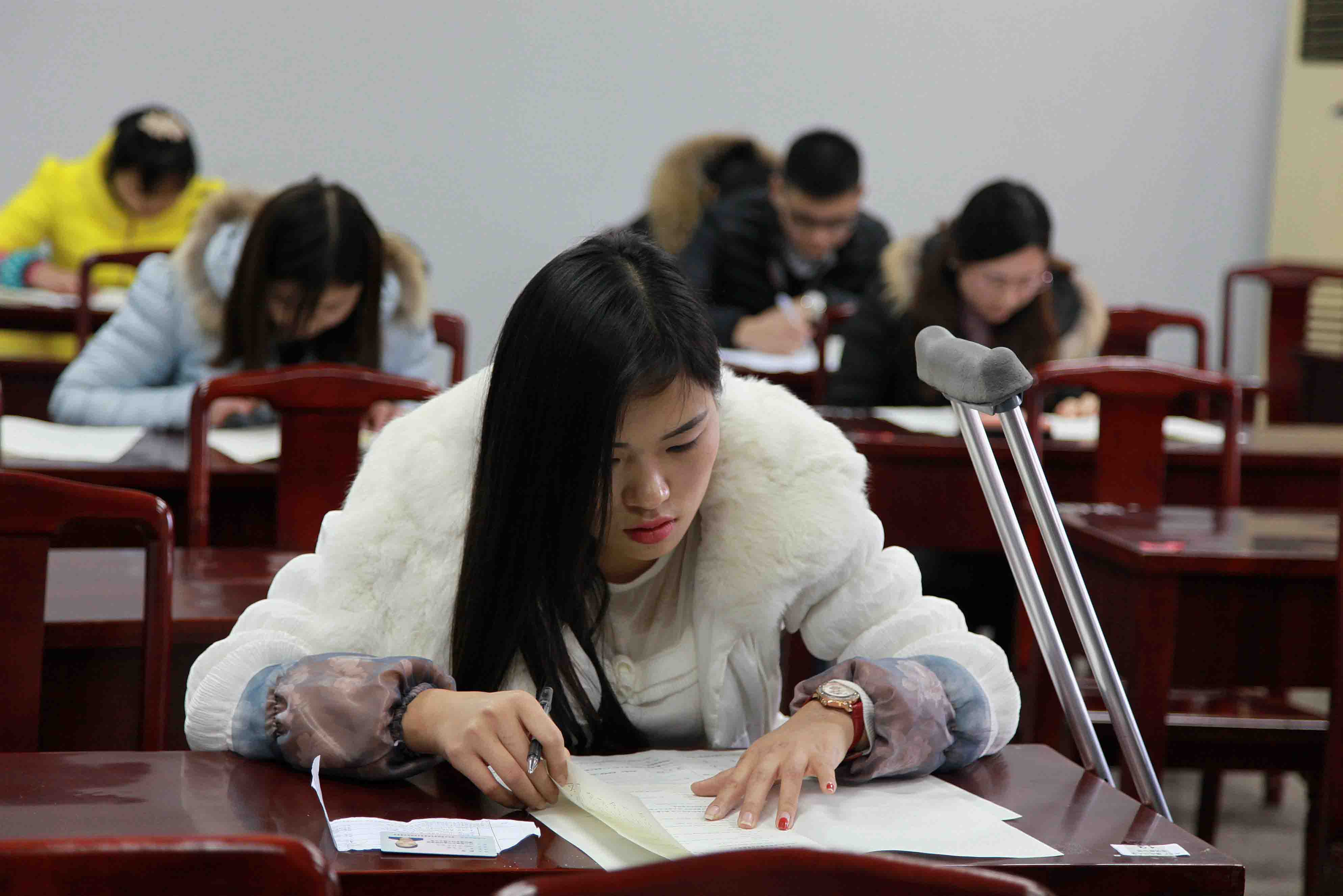 圖為2015年秋季行管專科趙芳同學(xué)拄著拐杖參加期末考試現(xiàn)場(chǎng)