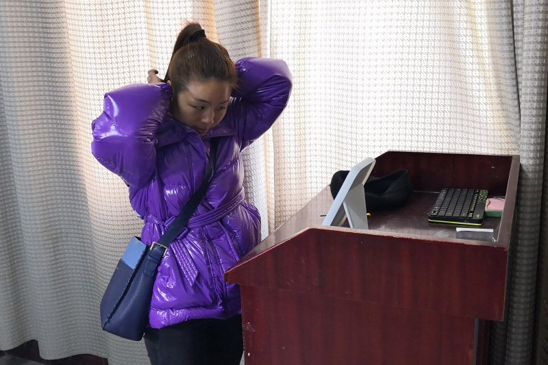學(xué)生在鏡子前整理妝容