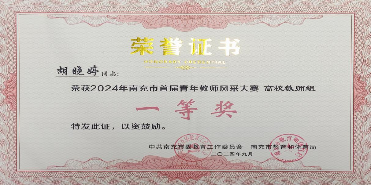 恰逢第 40 個教師節(jié)之際,我校再獲喜訊,參加南充市首屆青年教師風(fēng)采大賽的兩名青年教師斬獲佳績。其中胡曉婷老師榮獲高校組一等獎,周雪老師榮獲得高校組優(yōu)秀獎。