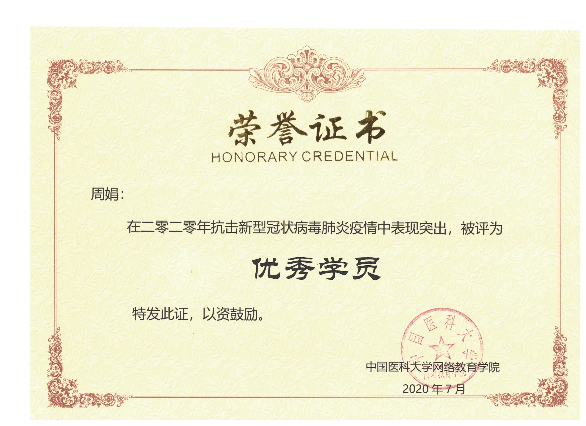 南充電大四川南充奧鵬學(xué)習(xí)中心中國醫(yī)科大學(xué)網(wǎng)絡(luò)教育學(xué)院2020年秋季護(hù)理學(xué)專業(yè)畢業(yè)生周娟,是川北醫(yī)學(xué)院附屬醫(yī)院在2020年春節(jié)第一批派往武漢的醫(yī)護(hù)人員,在武漢紅會醫(yī)院從事一線工作,被中國醫(yī)科大學(xué)評為“抗疫優(yōu)秀學(xué)員”。南充電大全體教職工及學(xué)生稱贊有加。
