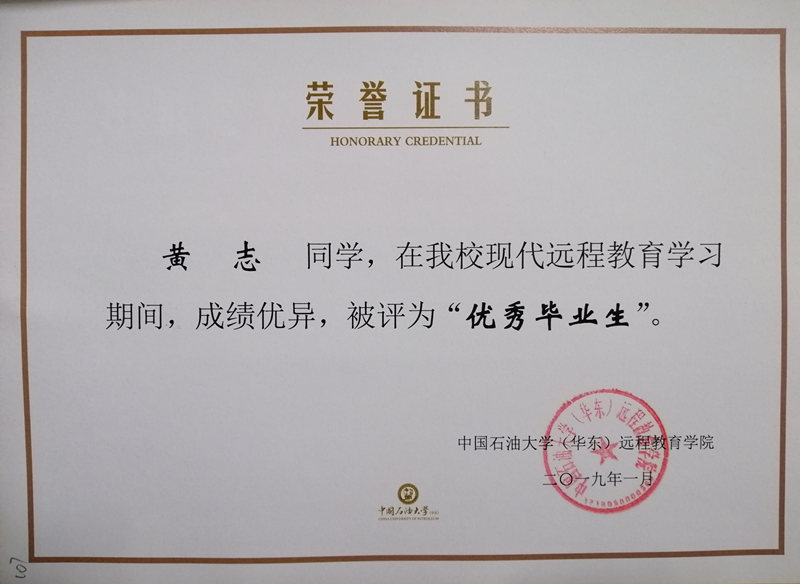 黃志同學就讀的中國石油大學(華東)遠程教育學院起源于北京石油學院時期1956年開辦的函授教育,是石油行業(yè)成人高等教育的開啟者。2001年,經(jīng)教育部批準開展現(xiàn)代遠程教育,成為當時全國38所試點高校之一,2013年成立遠程教育學院。依托中國石油大學(華東)學科優(yōu)勢,遠程教育學院構(gòu)建由石油專業(yè)為主、社會通用專業(yè)為輔的專業(yè)體系,黃志同學就讀于化工工藝專業(yè)。因為是理工科專業(yè)高校加上中國石油大學(華東)專業(yè)的特殊性,學生從事的行業(yè)往往都在野外郊區(qū),離城區(qū)較遠,工作環(huán)境十分艱苦,網(wǎng)絡信號不穩(wěn)定,這對于網(wǎng)絡教育的學生而言,無疑增加了一定的學習難度。黃志同志在克服嚴峻的工作環(huán)境和壓力的同時,在南充奧鵬學習中心兩年多期間的學習也絲毫沒有松懈。