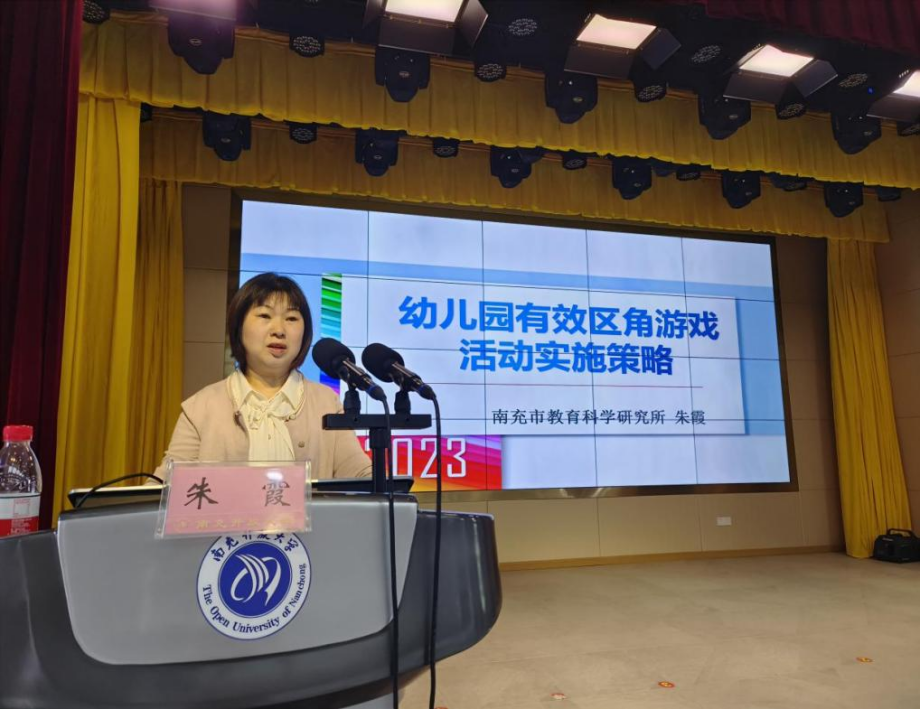 下午,南充市教育科學(xué)研究所辦公室主任、學(xué)前教育教研員朱霞以《幼兒園有效區(qū)角游戲活動實施策略》為題,為學(xué)員帶來又一場知識盛宴。朱主任針對區(qū)角游戲環(huán)境的創(chuàng)設(shè)、區(qū)角游戲材料的選擇和投放、區(qū)角游戲材料的調(diào)整和變更、區(qū)角游戲中教師的科學(xué)指導(dǎo)逐一作了具體的闡釋,并結(jié)合大量案例深入淺出地詮釋了區(qū)角游戲應(yīng)遵循的七大原則。學(xué)員們深切地認識到區(qū)角游戲是發(fā)展幼兒多種能力和自主學(xué)習(xí)的重要途徑,是以“兒童發(fā)展為本”的理念呼吁下運用而生的學(xué)習(xí)活動。