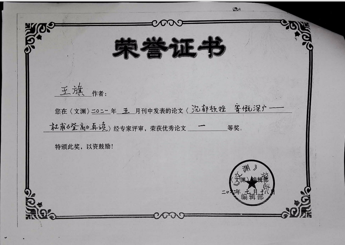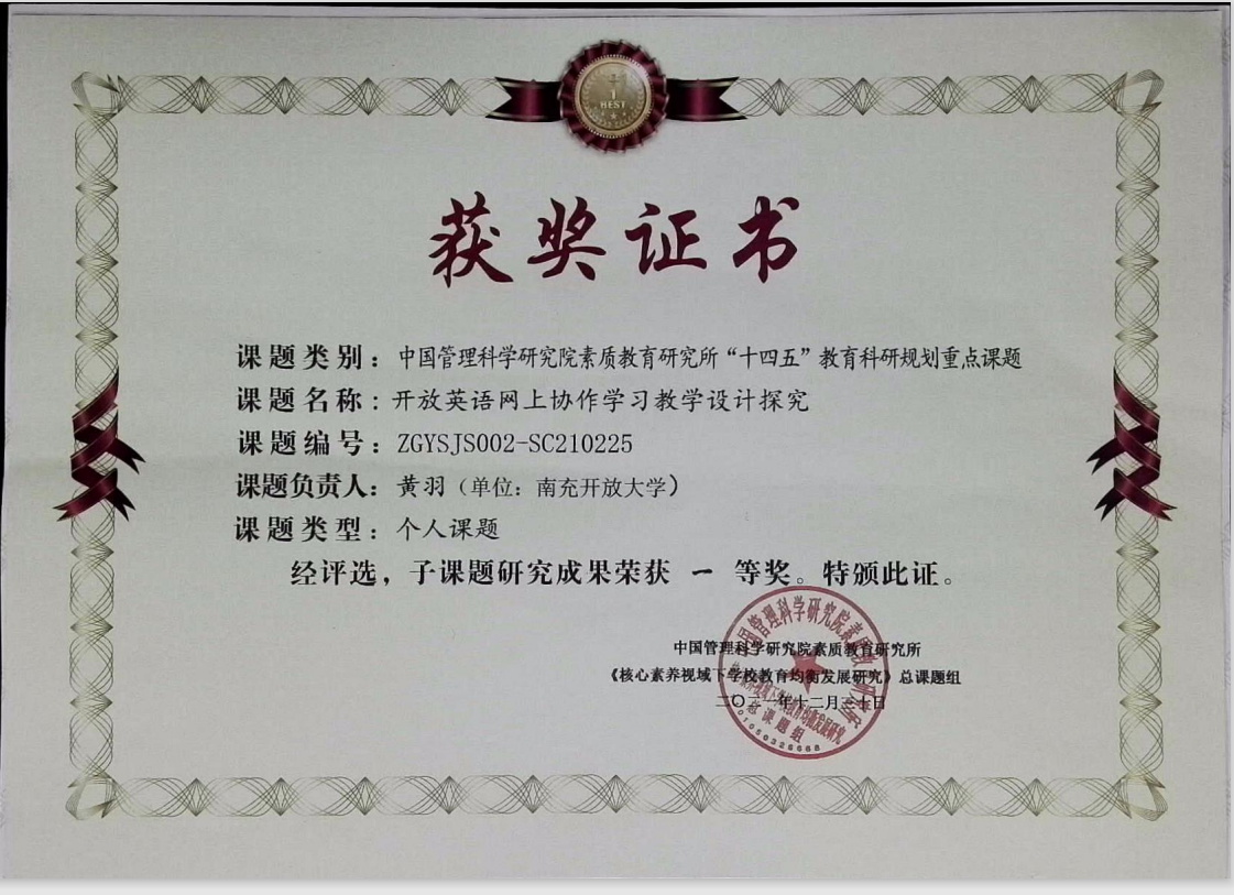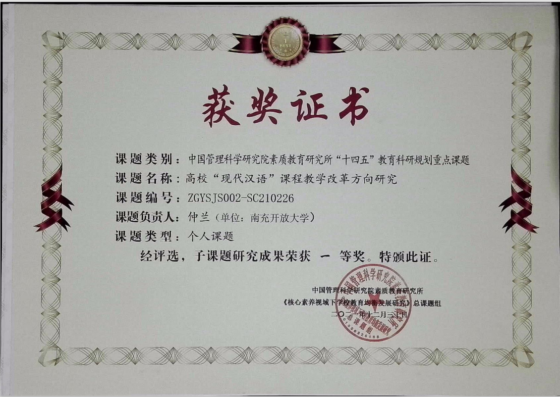 王旗的文章《沉郁頓挫 寄慨深廣——杜甫《登高》再讀》獲文淵編輯部優(yōu)秀論文一等獎;黃羽的課題《開放英語網(wǎng)上協(xié)作學習教學設計探究》、仲蘭的課題《高校“現(xiàn)代漢語”課程教學改革方向研究》研究成果被評為中國管理科學研究院素質(zhì)教育研究所“十四五”教育科研規(guī)劃重點課題一等獎。